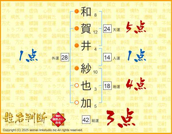和(8画)賀(12画)井(4画) 紗(10画)也(3画)加(5画)