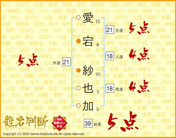 愛(13画)宕(8画) 紗(10画)也(3画)加(5画)