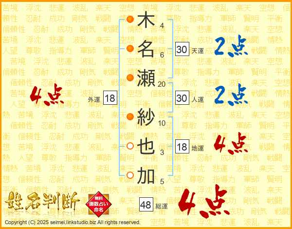 木(4画)名(6画)瀬(20画)  紗(10画)也(3画)加(5画)