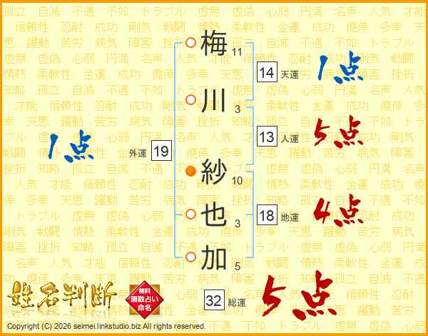 梅(11画)川(3画) 紗(10画)也(3画)加(5画)