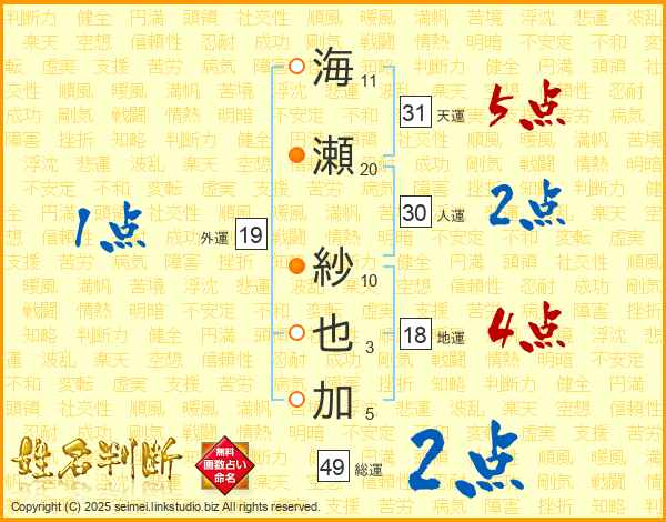 海瀬紗也加さんの天運は31画の5点!