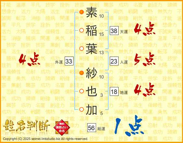 素稲葉紗也加さんの総運は56画の1点!