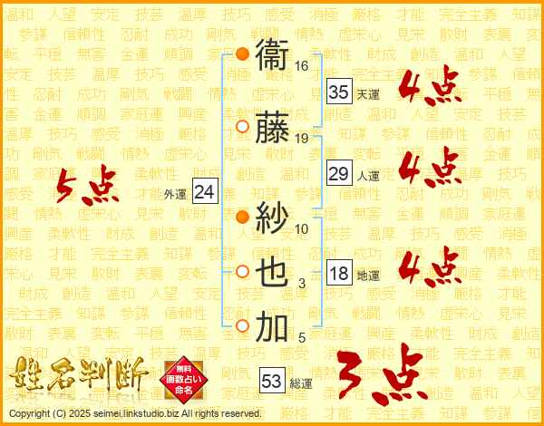 衞(16画)藤(19画) 紗(10画)也(3画)加(5画)