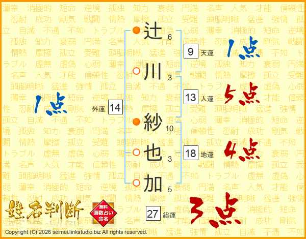 辻(6画)川(3画) 紗(10画)也(3画)加(5画)