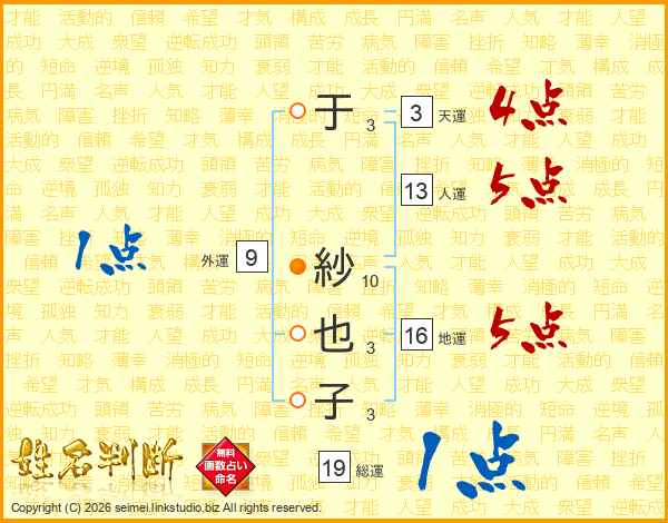 生活面を象徴する運勢です。外部から受ける影響力を表し、結婚運、家庭運や職場、環境への順応性を表します。総運から人運を引いた画数。姓や名が1文字の場合を除く。