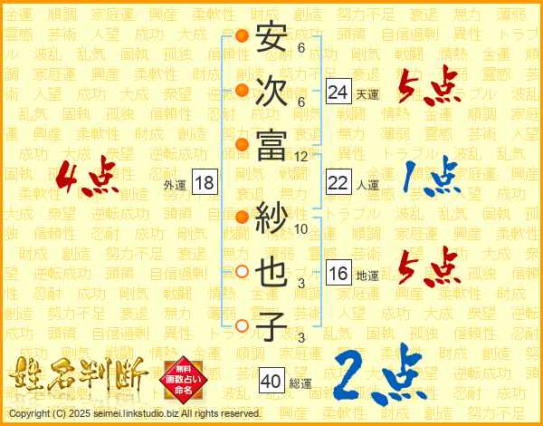 安(6画)次(6画)富(12画) 紗(10画)也(3画)子(3画)