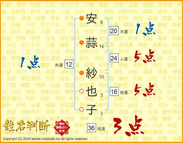 安(6画)蒜(14画) 紗(10画)也(3画)子(3画)