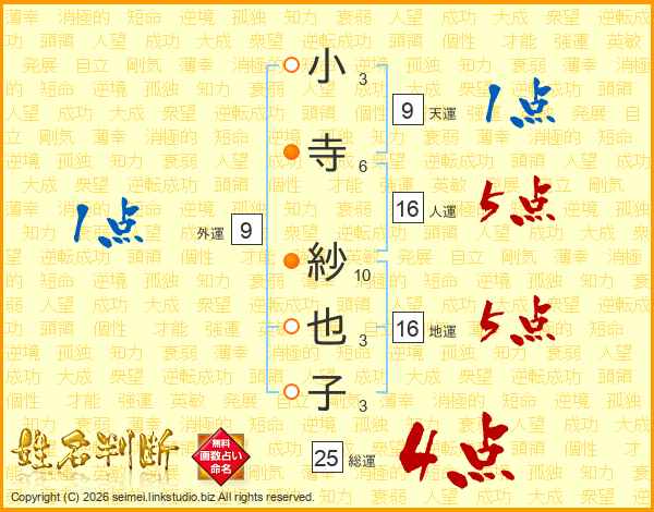 小寺紗也子さんの総運は25画の4点!