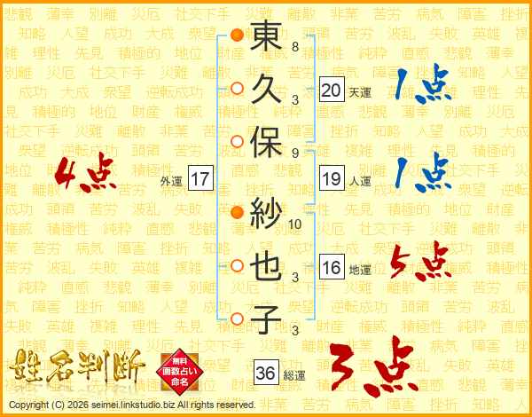 東(8画)久(3画)保(9画) 紗(10画)也(3画)子(3画)