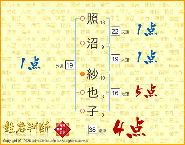 照沼紗也子さんの総運は38画の4点!