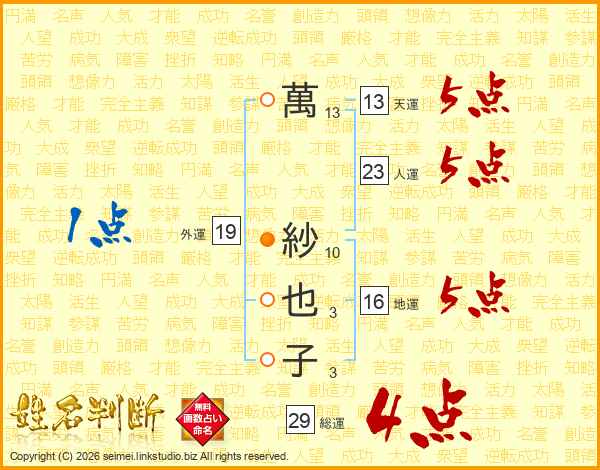萬紗也子さんの総運は29画の4点!