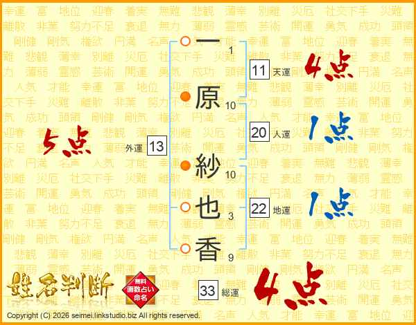 一(1画)原(10画) 紗(10画)也(3画)香(9画)