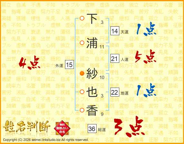 下浦紗也香さんの人運は21画の5点!