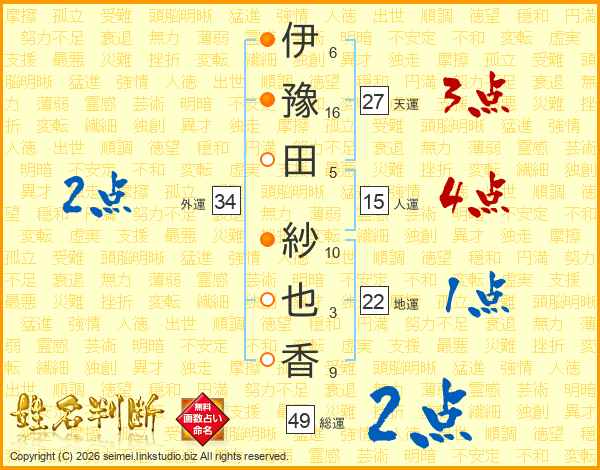 伊(6画)豫(16画)田(5画) 紗(10画)也(3画)香(9画)