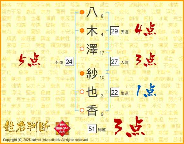 八(8画)木(4画)澤(17画) 紗(10画)也(3画)香(9画)