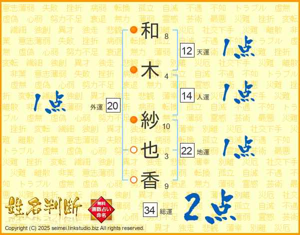 和(8画)木(4画) 紗(10画)也(3画)香(9画)