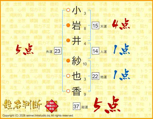 小(3画)岩(8画)井(4画) 紗(10画)也(3画)香(9画)