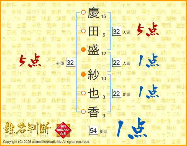 慶(15画)田(5画)盛(12画) 紗(10画)也(3画)香(9画)