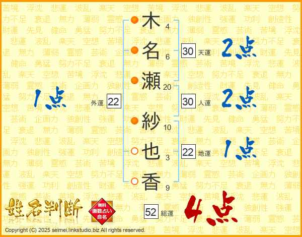 木名瀬紗也香さんの総運は52画の4点!