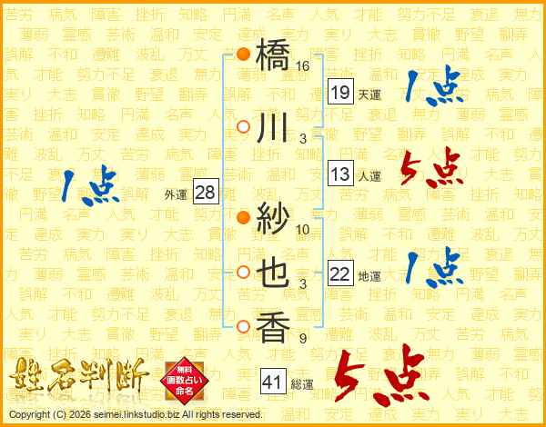 橋(16画)川(3画) 紗(10画)也(3画)香(9画)