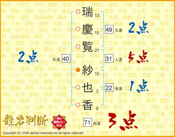 瑞(13画)慶(15画)覧(21画) 紗(10画)也(3画)香(9画)