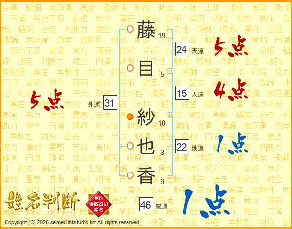 藤(19画)目(5画) 紗(10画)也(3画)香(9画)