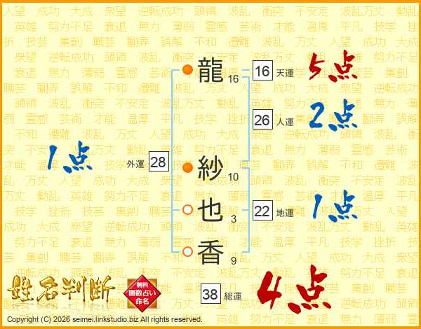 龍(16画) 紗(10画)也(3画)香(9画)