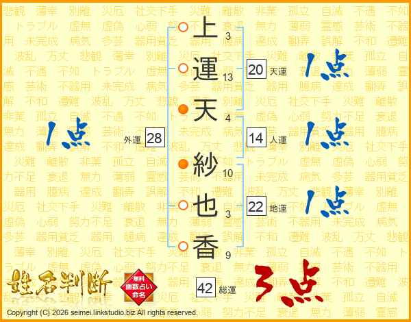 上(3画)運(13画)天(4画) 紗(10画)也(3画)香(9画)