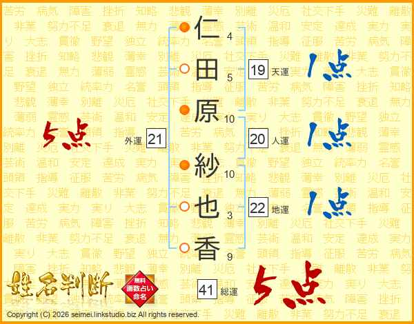 仁(4画)田(5画)原(10画) 紗(10画)也(3画)香(9画)
