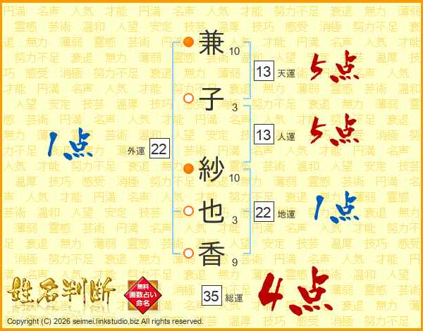 兼子紗也香さんの天運は13画の5点!
