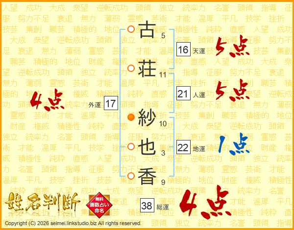 古(5画)荘(11画) 紗(10画)也(3画)香(9画)