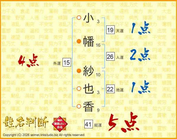 小(3画)幡(16画)  紗(10画)也(3画)香(9画)