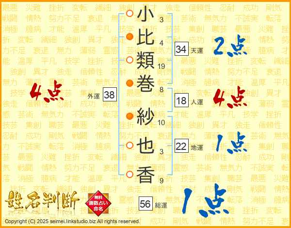 小(3画)比(4画)類(19画)巻(8画) 紗(10画)也(3画)香(9画)