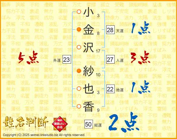 小(3画)金(8画)沢(17画) 紗(10画)也(3画)香(9画)