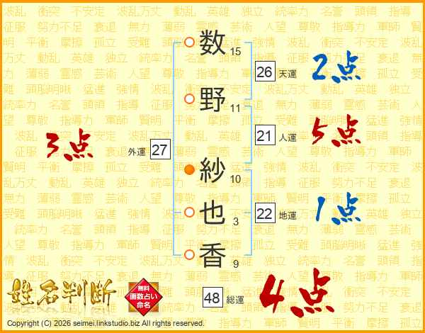 数(15画)野(11画) 紗(10画)也(3画)香(9画)