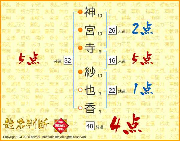 神(10画)宮(10画)寺(6画) 紗(10画)也(3画)香(9画)