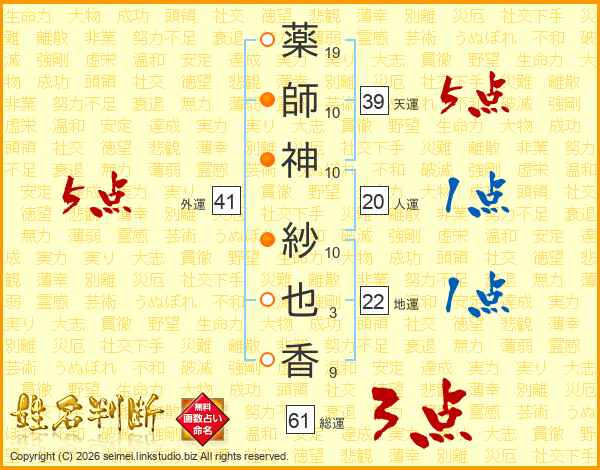 薬(19画)師(10画)神(10画) 紗(10画)也(3画)香(9画)