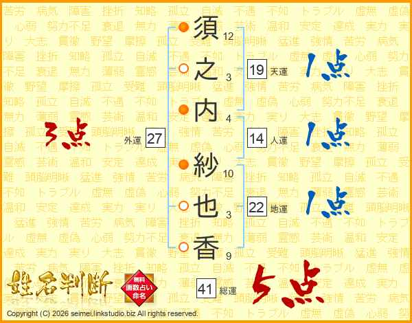 須(12画)之(3画)内(4画) 紗(10画)也(3画)香(9画)