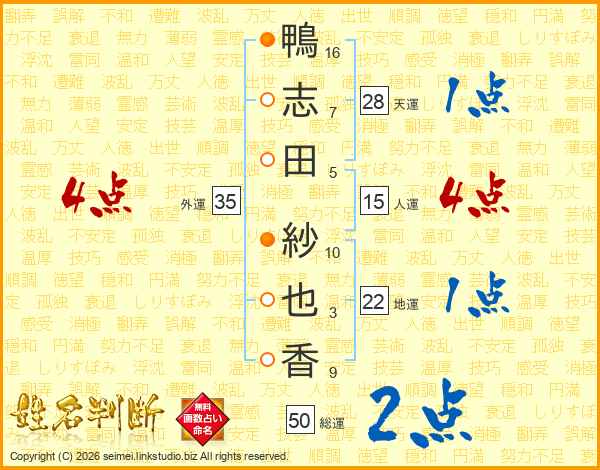 鴨(16画)志(7画)田(5画) 紗(10画)也(3画)香(9画)