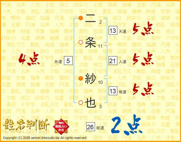 あなたの人生を表す1番重要な運勢です。生涯を通じて影響する総合運となり、主に50歳以降の晩年期に影響を及ぼします。苗字と名前の合計画数。