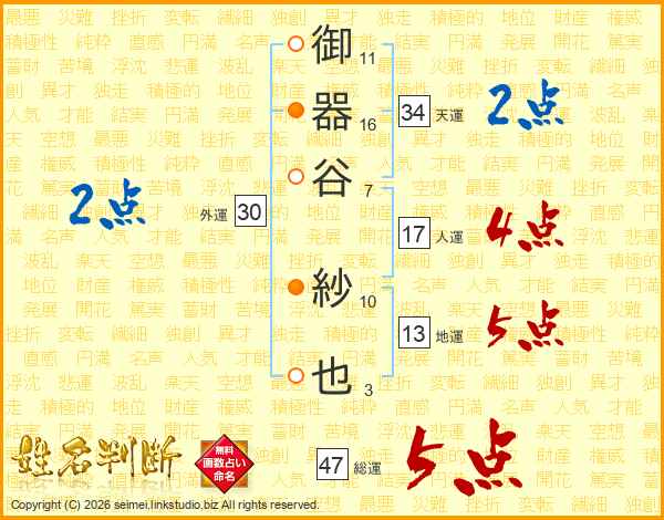 御(11画)器(16画)谷(7画) 紗(10画)也(3画)