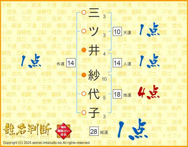 三(3画)ツ(3画)井(4画) 紗(10画)代(5画)子(3画)