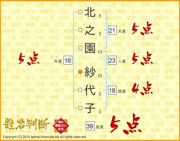 北(5画)之(3画)園(13画) 紗(10画)代(5画)子(3画)