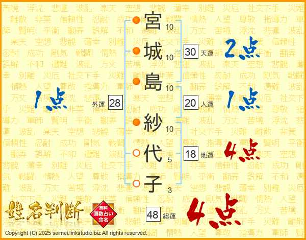 宮(10画)城(10画)島(10画) 紗(10画)代(5画)子(3画)