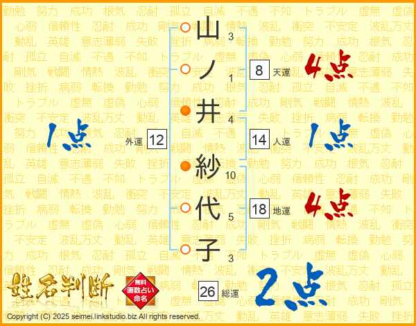 山(3画)ノ(1画)井(4画) 紗(10画)代(5画)子(3画)
