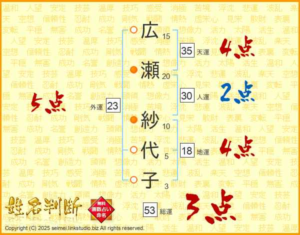広瀬紗代子さんの総運は53画の3点!
