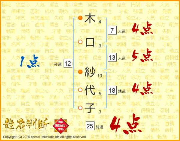 木(4画)口(3画) 紗(10画)代(5画)子(3画)