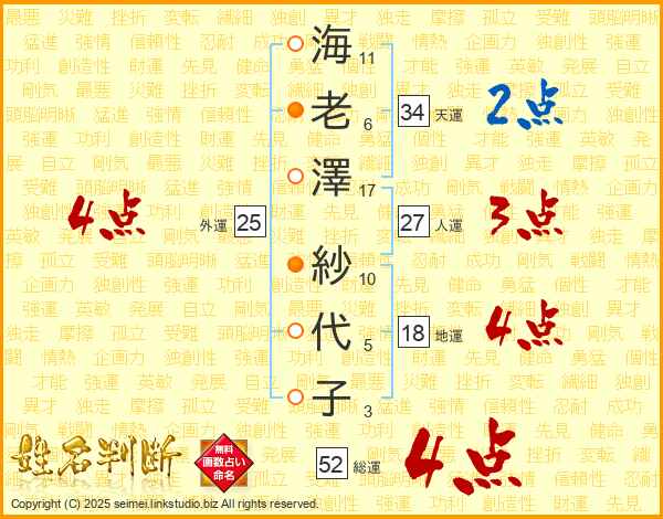海(11画)老(6画)澤(17画) 紗(10画)代(5画)子(3画)