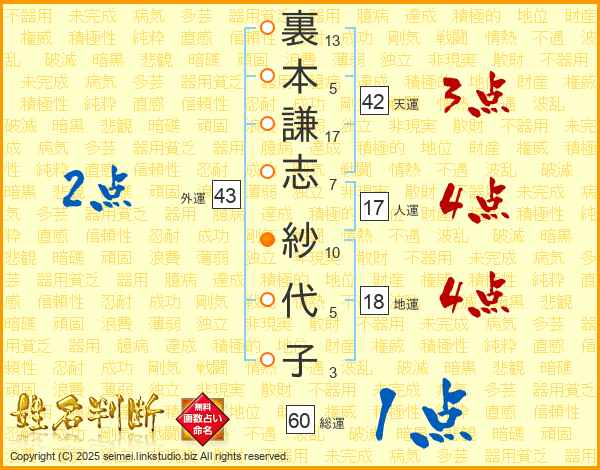 裏(13画)本(5画)謙(17画)志(7画) 紗(10画)代(5画)子(3画)
