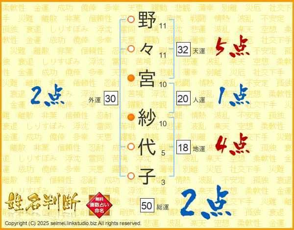 野(11画)々(11画)宮(10画) 紗(10画)代(5画)子(3画)